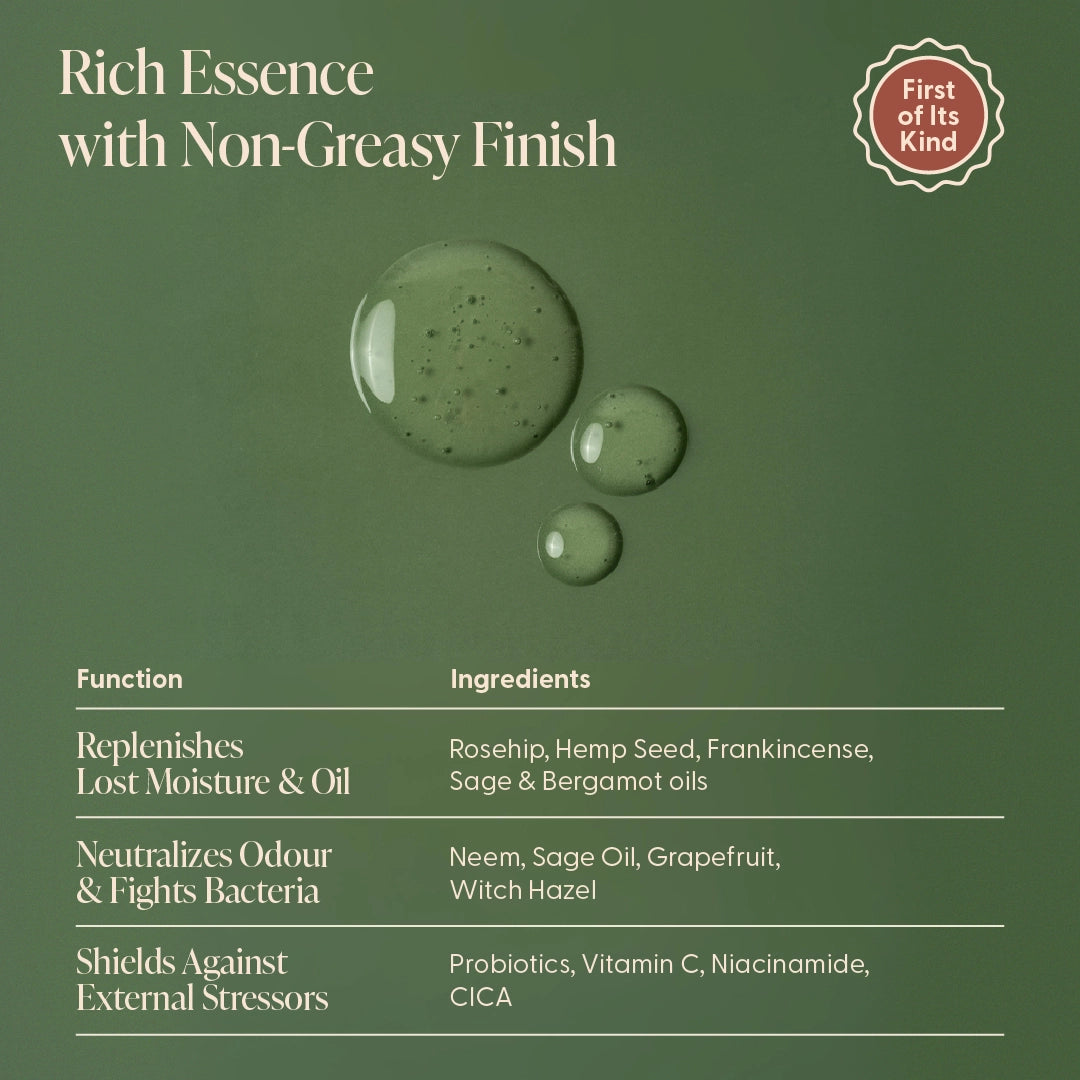 Aqua, Propylene Glycol, Propanediol, Glycerin, Allantoin, Niacinamide, Ascorbic Acid (Vitamin C), Neem Extract, Hamamelis Virginiana (Witch Hazel) Extract, Centella Asiatica Extract, Sodium Hyaluronate, Lotus Seed Extract, Dimethyl Isosorbide, Citrus Grandis (Grapefruit) Extract, Aloe Barbadensis (Aloe Vera) Extract, Rosa Canina (Rosehip) Oil, Cannabis Sativa (Hemp Seed) Oil, Punica Granatum (Pomegranate) Extract, Boswellia Serrata (Frankincense) Oil, Salvia Officinalis (Sage) Oil, Citrus Aurantium Bergamia (Bergamot) Oil, Lactobacillus Probiotic, Phenoxyethanol & Ethylhexylglycerin, Sodium Gluconate.